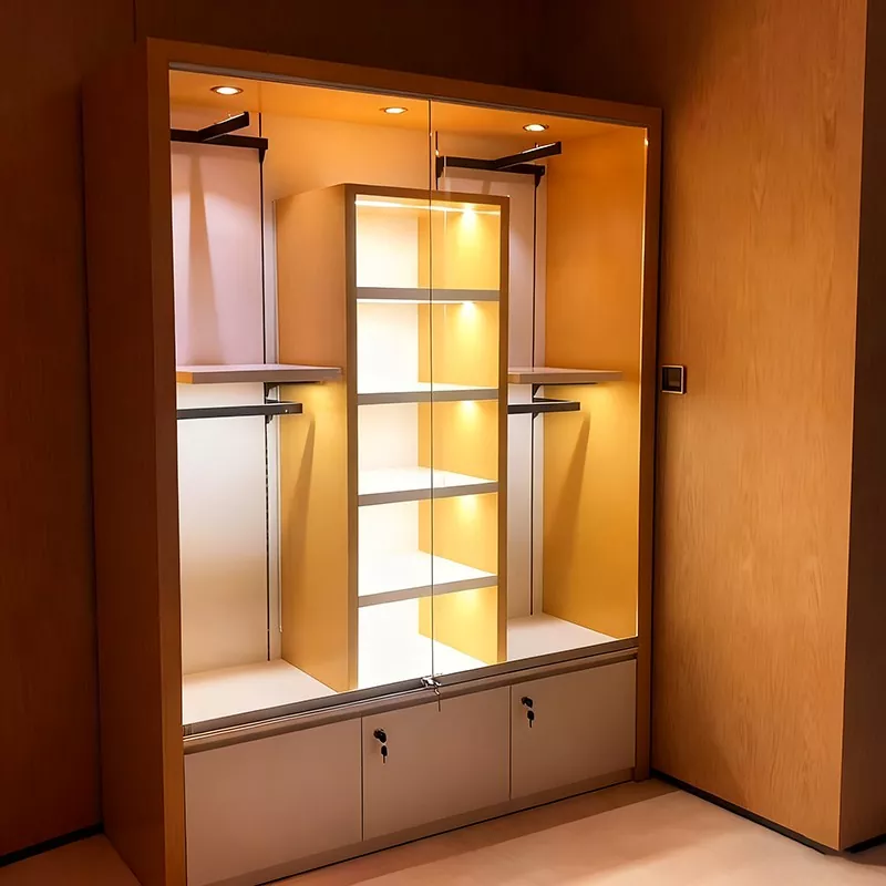 কাঠের ডিসপ্লে কেসের গঠন প্রধানত দুই প্রকারে বিভক্ত। এক প্রকার ঐতিহ্যগত ফ্রেম গঠন। কাঠের ব্লকগুলি একটি স্থিতিশীল ফ্রেম তৈরি করতে ব্যবহৃত হয় এবং তারপরে বোর্ডগুলি স্থাপন করা হয়। আমরা প্রায়ই কঠিন কাঠ এবং উচ্চ-শেষ কৃত্রিম বোর্ড ক্যাবিনেট সংস্থার জন্য এটি ব্যবহার করি। আরেকটি প্রকার আধুনিক প্যানেল কাঠামো, যা MDF বা মাল্টি-লেয়ার বোর্ড এবং অন্যান্য প্যানেল দিয়ে তৈরি, হার্ডওয়্যার এবং স্ক্রু দ্বারা সংযুক্ত। এই ফর্মটি উত্পাদনের ক্ষেত্রে প্রমিত, বিচ্ছিন্ন করা এবং একত্রিত করা সহজ, এবং এর দাম কম।